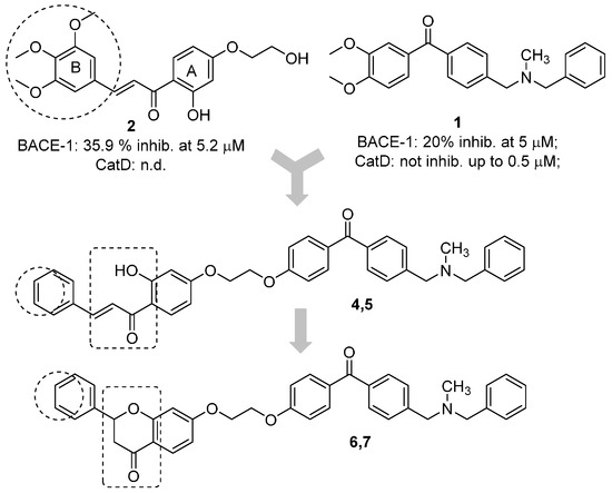 The benzophenone core is known to be a privileged structure, suitable to be exploited to provide effective ligands for different molecular targets involved in AD [16,17]. In an effort aimed at obtaining multipotent AD therapeutics, our in-house collection of naturally inspired small molecules was screened against the BACE-1 enzyme, and some promising hit compounds were identified. Among them, compounds 1 and 2 (Figure 1), bearing a benzophenone and a chalcone framework, respectively, showed a promising BACE-1 inhibition (36% and 20%, respectively) when tested at 5 µM concentration. In a previous work, the benzophenone 1, bearing a N,N’-benzylmethylamine moiety, was selected as the main scaffold to be optimized, allowing us to obtain a mutitarget AD-drug candidate able to efficiently inhibit BACE-1 enzyme (low-micromolar potency) and to offer protection against Aβ-induced neurotoxicity as well [18]. Moreover, computational studies showed that the N,N’-benzylmethylamine function of 1 could appropriately interact with the catalytic dyad of the enzyme. As for the second selected scaffold, chalcones (1,3-diarylpropen-1-ones) occupy a special place as privileged structures among NPs. Peculiar chemical features of the hit 2 were an alkoxy side chain and a hydroxyl group ortho to the carbonyl function (A-ring), while the B-ring was decorated with a 3,4,5-trimethoxy substitution pattern.