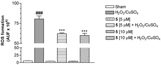 Effect of compound 5 on ROS formation elicited by H2O2/CuSO4 in SH-SY5Y cells. The cells were treated with various concentrations of 5 and H2O2 (100 µM)/CuSO4 (25 µM) for 30 min. At the end of the incubation, intracellular ROS formation was determined using a fluorescence probe, as described in the Materials and Methods section. The arbitrary units of fluorescence (AUF) values are shown as mean ± SD of at least three independent experiments (### P < 0.001 versus untreated cells, *** P < 0.001 versus cells treated with H2O2/CuSO4, at ANOVA with Bonferroni’s Post Hoc Test).