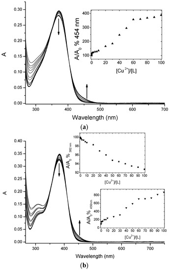 The addition of increasing amounts of Cu(II) ions in solution caused a decrease of the maximum of this band for both ligands, with a concomitant increase of the absorbance around 450 nm. These changes are quite small, but in line with other similar systems already reported in the literature, and therefore diagnostic for the copper complex formation [28].