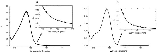 Therefore, we decided to carry on the spectrophotometric measurements in a mixed solvent: aqueous MOPS aqueous buffer 1 × 10−2 M pH 7.4 /DMF in 1:4 ratio, respectively. Flavonoids bearing the 4-carbonyl-5-hydroxyl chelation site have characteristic UV-vis spectra, characterized by a wide and non-structured band centred around 370–380 nm, with a molar extinction coefficient of 50,000 cm−1·M−1 that is attributed to HOMO-LUMO transition with a π-π* character.