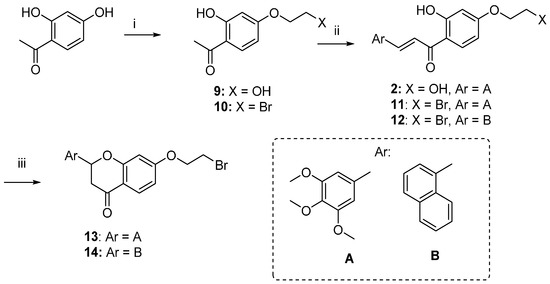 Synthesis of intermediates 10–14. Reagents and Conditions: (i) 1-Bromoethanol or 1,2-dibromoethane, K2CO3, acetone, reflux; (ii) substituted benzaldehydes, KOH, EtOH, rt.; (iii) NaOAc, EtOH, 80 °C, reflux.