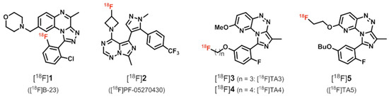 Besides [18F]1 and [18F]2, three 18F-labeled imidazopyridotriazine derivatives as potential PDE2A radioligands for PET, [18F]3, [18F]4, and [18F]5 ([18F]TA3–5, Figure 1), have been developed in our group [60,61,62] based on a patented lead compound [43].