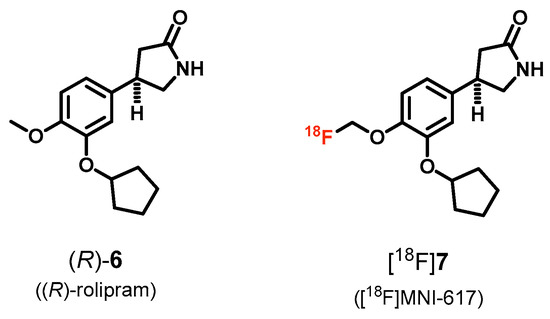 Very recently, Thomae et al. [82,83] reported on the development of structurally modified derivatives of (R)-6 with the aim to generate 18F- and 123I-labeled PDE4 radioligands for PET or SPECT application, respectively. In general, low tolerance of PDE4 for structural changes in (R)-6 has been stated as well as a significant decrease in PDE4 affinity for the iodo derivatives that consequently have been suggested to be not suitable as SPECT radioligands. Out of this series, the fluorinated analogue 7 (MNI-617, Figure 2) has been described as the most promising compound with a five-fold increased PDE4 affinity over (R)-6 (KD = 0.26 nM vs. 1.6 nM) and thus has been selected for 18F-labeling [82,83].