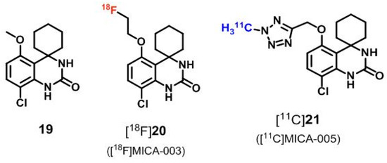 In 2015, Thomae et al. [121,122] reported on the development of the first two radiolabeled derivatives for that purpose, [18F]20 ([18F]MICA-003) and [11C]21 ([11C]MICA-005), based on a series of spiroquinazolinones as potent dual PDE7A/B inhibitors, like compound 19 [123] (Figure 4).