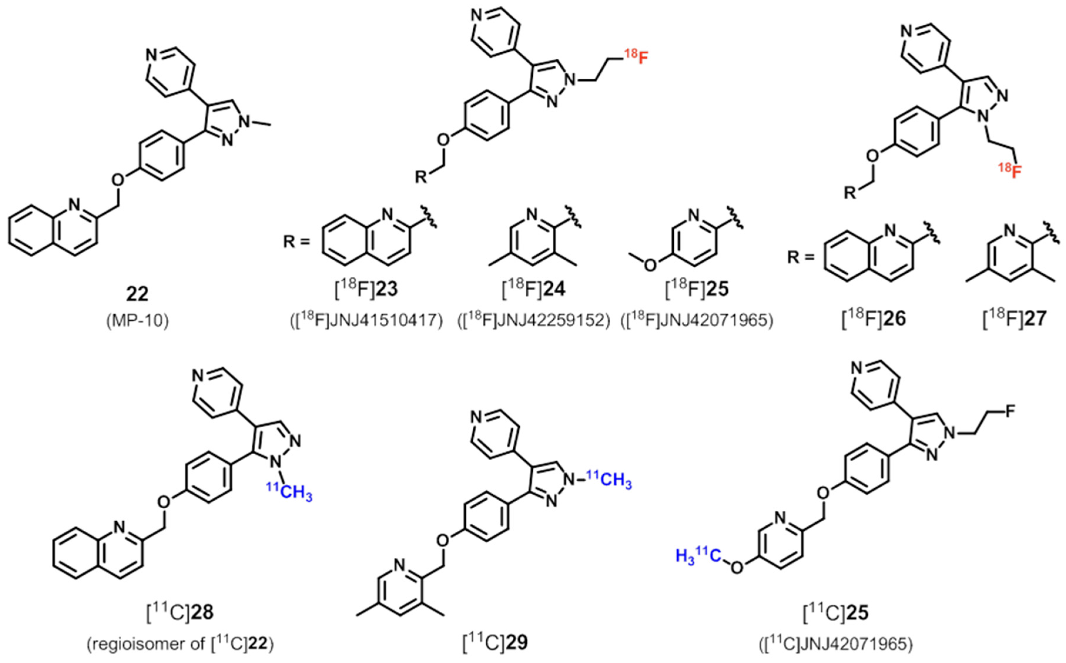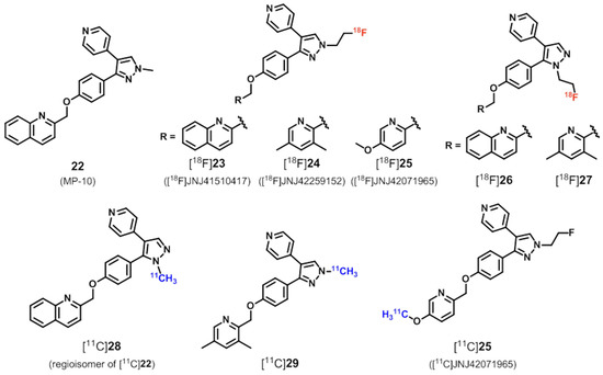 Based on the highly potent PDE10A inhibitor 22 (MP-10, IC50 = 1.26 nM [139]; IC50 = 0.37 nM [140]; IC50 = 0.18 nM with 100-fold selectivity over other PDEs [141]; IC50 = 0.02 nM [142]; IC50 = 0.64 nM [143]) and the radiolabeled analogue, [11C]22 ([11C]MP-10) [141,144,145,146,147], a series of structurally related 11C- and 18F-labeled derivatives have been developed for PET imaging of PDE10A as partly reviewed in 2012 by Andrés et al. [25,143,144,148,149,150,151] (Figure 5).