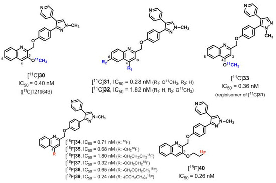 Recently, Fan et al. [157] and Li et al. [158] reported on the development of further 11C- and 18F-labeled derivatives (Figure 6) out of a small library of pyrazolo-N-methyl regioisomers of compound 22 (MP-10) with different substitution patterns at the 2-methylquinoline moiety [158,159].