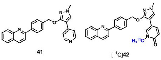 In 2015, Hamaguchi et al. [161] reported on the development of another series of compound 22-related derivatives based on the quinoline analogue 41 [162] (Figure 7). Compared to 22 (MP-10), compound 41 is of reduced inhibitory potency towards PDE10A (IC50 = 29 nM vs. 0.55 nM [161,162]), but of higher metabolic stability as shown by in vitro studies using mouse and human liver microsomes (M/HLM) [162]. Structural modification of 41 led to the most promising derivative 42 that exhibited a significantly increased PDE10A potency (IC50 = 5.1 nM) and further enhanced in vitro stability in M/HLM studies [161]. Thus, 42 has been selected for 11C-labeling to evaluate this novel PDE10A inhibitor in vivo with PET (Figure 7).