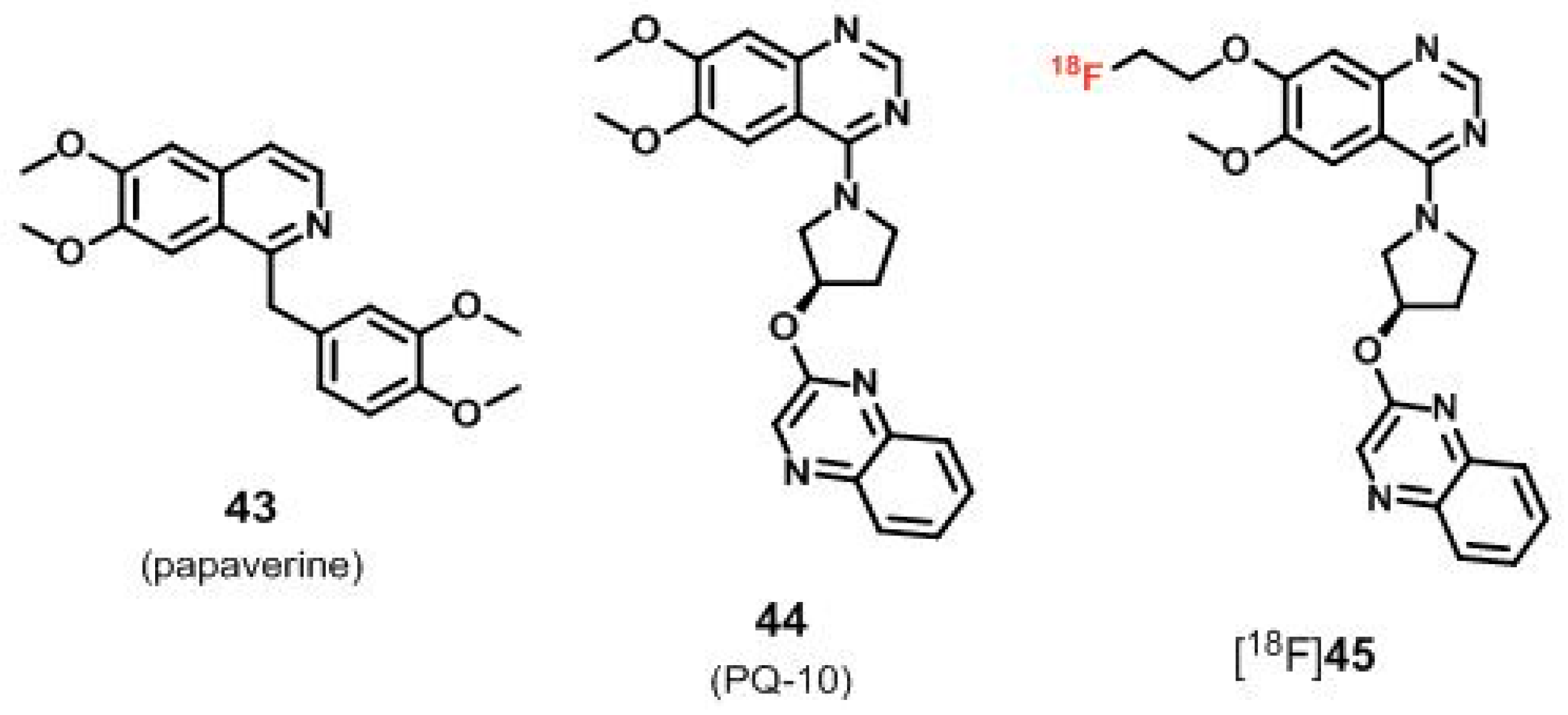 To possibly overcome the problem of metabolic stability of derivatives related to the scaffold of compound 22 (MP-10), our group generated the structurally different radioligand [18F]45 [163,164] (Figure 8) for PET imaging of PDE10A that has already been mentioned by Andrés et al. [25]. Based on the potent papaverine-related PDE10A inhibitor 44 (PQ-10, Ki = 4 nM [165]; IC50 = 16 nM [166]) published by Pfizer [165] (Figure 8), the novel corresponding 18F-labeled fluoroethyl derivative [18F]45 has been developed [164,166].