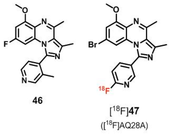 Consequently, further development of appropriate PDE10A radioligands in our group was based on an alternative structural approach using 1-arylimidazo[1,5-a]quinoxaline 46 (Figure 9) as lead compound [169]. Out of a small library of 1- and 8-(2′-fluoro)pyridine-substituted derivatives of 46 [170,171], compound 47 (AQ28A, Figure 9) showed high potency as well as best selectivity towards PDE10A (IC50 = 2.95 nM and > 1000 nM for all other PDEs [171]) and has been selected for 18F-labeling [170,172,173].