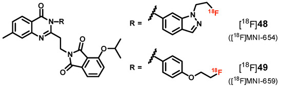 The radioligands published by Barret et al. [175,176], [18F]48 and [18F]49 ([18F]MNI-654 and [18F]MNI-659, Figure 10), are of high PDE10A binding affinity with KD-values of 0.029 nM and 0.097 nM [176], respectively.