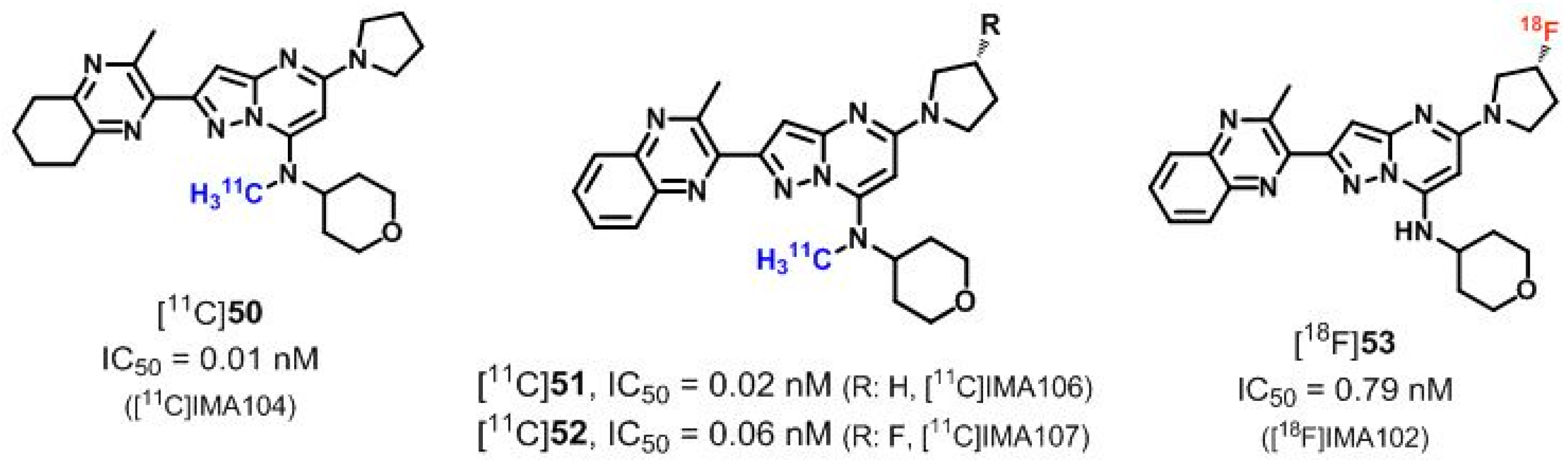 On the basis of a pyrazolopyrimidine scaffold, Plisson et al. [142] reported on the development of three 11C- and one 18F-labeled derivatives that have been selected based on the inhibitory potencies of the related non-radioactive compounds 5053 towards PDE10A (Figure 11).