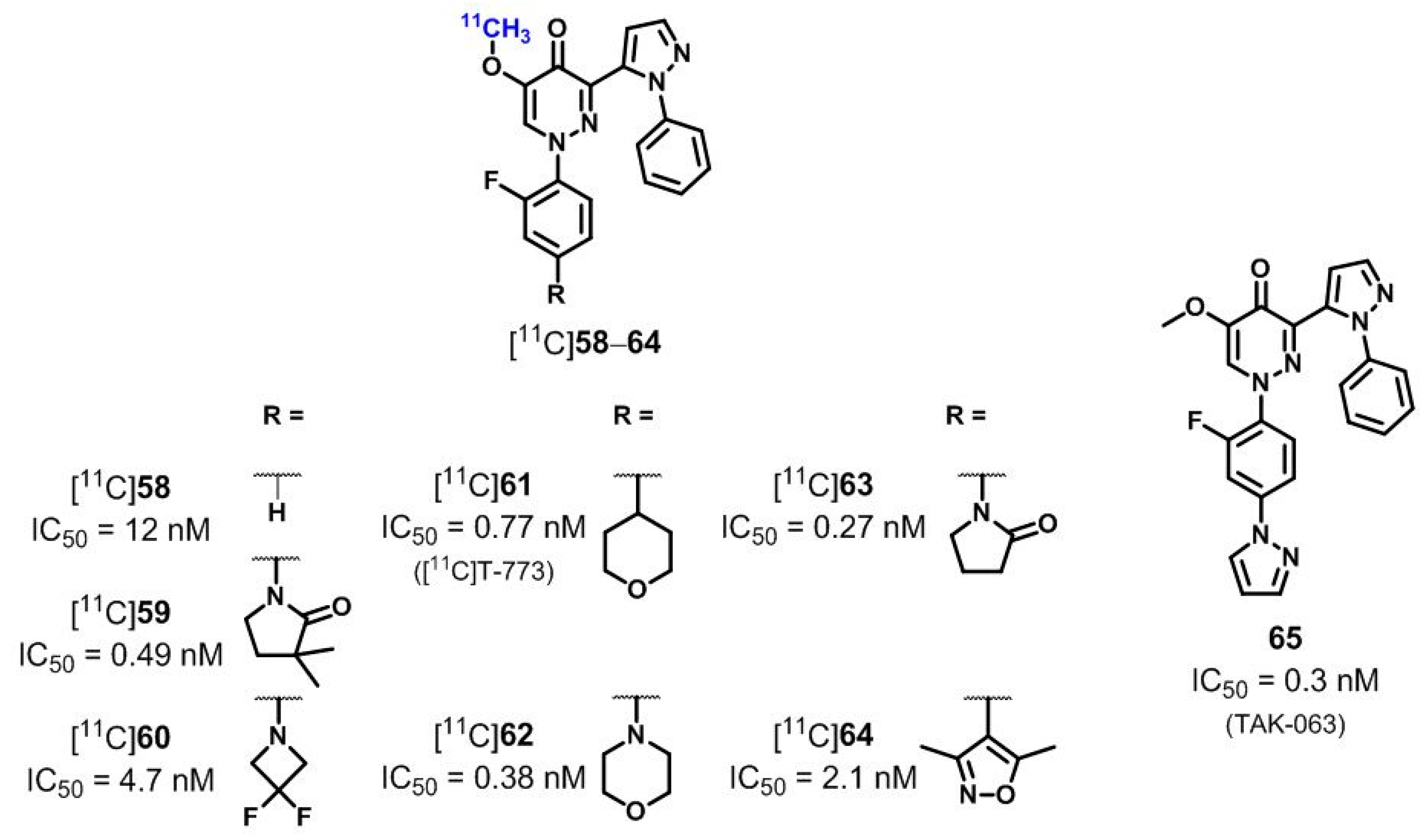 Very recently, [11C]61 has been applied in a PET study [194] investigating the PDE10A brain occupancy by the novel PDE10A inhibitor 65 (TAK-063, Figure 13) in non-human primates [195]. The results additionally provide evidence for the suitability of [11C]61 to evaluate striatal PDE10A levels in vivo although unclear interactions of uptake between [11C]61 and 65 in the non-target region cerebellum have been observed (decreased uptake of [11C]61 after pre-treatment with 65) [194].