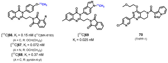 In baseline PET studies in rhesus monkeys, [11C]66 ([11C]MK-8193) showed a high brain uptake with a PDE10A-specific accumulation in striatum followed by a fast wash-out phase. In comparison to [11C]66, the derivative [11C]68 displayed high non-specific binding and a possibly brain penetrating radiometabolite, [11C]67 showed lower specificity of binding, and [11C]69 revealed slower overall elimination [196]. Development of a [18F]fluoroethyl analogue of [11C]66 and in vivo evaluation of this radioligand has also been mentioned briefly without any related data published so far. Besides, further 11C-labeled analogues of the selective PDE10A inhibitor 70 (THPP-1, Figure 14) [198] have been studied in vivo that uniformly displayed poor brain uptake as also shortly reported in this article [196].