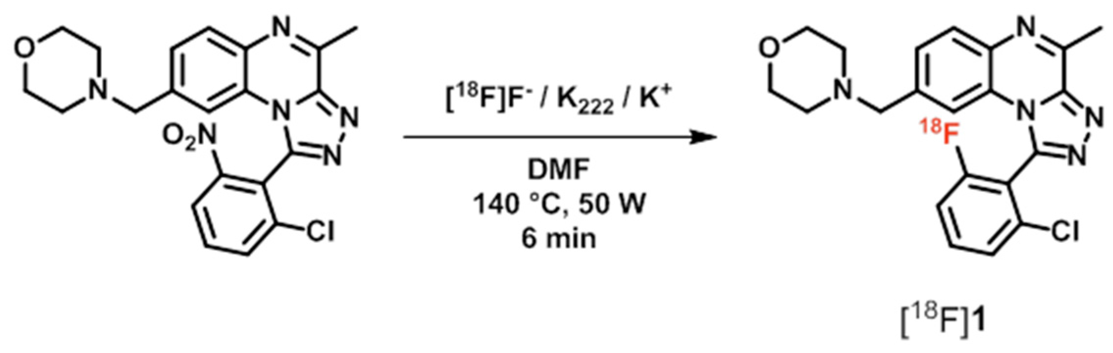 In 2013, the first two 18F-labeled PDE2A radioligands have been published by Janssen Pharmaceutica NV, [18F]1 ([18F]B-23) [48,55], and Pfizer Inc., [18F]2 ([18F]PF-05270430) [48,56] (Figure 1). The triazoloquinoxaline derivative 1 [48,55] is of high inhibitory potency towards the PDE2A protein, but of low PDE2A/PDE10A selectivity (IC50(PDE2A) = 1 nM; IC50(PDE10A) = 11 nM). Notably, the distribution pattern of PDE2A and PDE10A is comparable: both enzymes are highly expressed in the caudate nucleus as a part of the striatum [34]. For that reason, high selectivity of PET radioligands towards PDE2A is substantially for specific imaging of this enzyme. The 18F-labeled analogue [18F]1 has been synthesized in a one-step nucleophilic aromatic radiolabeling strategy by using the related nitro precursor and K+/[18F]F/K2.2.2-carbonate complex under microwave heating [55] (Scheme 1). In biodistribution and microPET imaging studies with rats, the highest accumulation of [18F]1 at 2 min post injection has been observed in striatum followed by hippocampus, cortex, and cerebellum [55]. However, the reported specific uptake in the striatum may be caused by binding of [18F]1 to PDE2A and PDE10A in this brain region as a result of its low selectivity. Additionally, polar radiometabolites have been detected in the brain with 4% of total activity at 2 min up to 18% at 10 min post injection [55]. In conclusion, [18F]1 appears not to be an appropriate radioligand for in vivo imaging of the PDE2A protein.