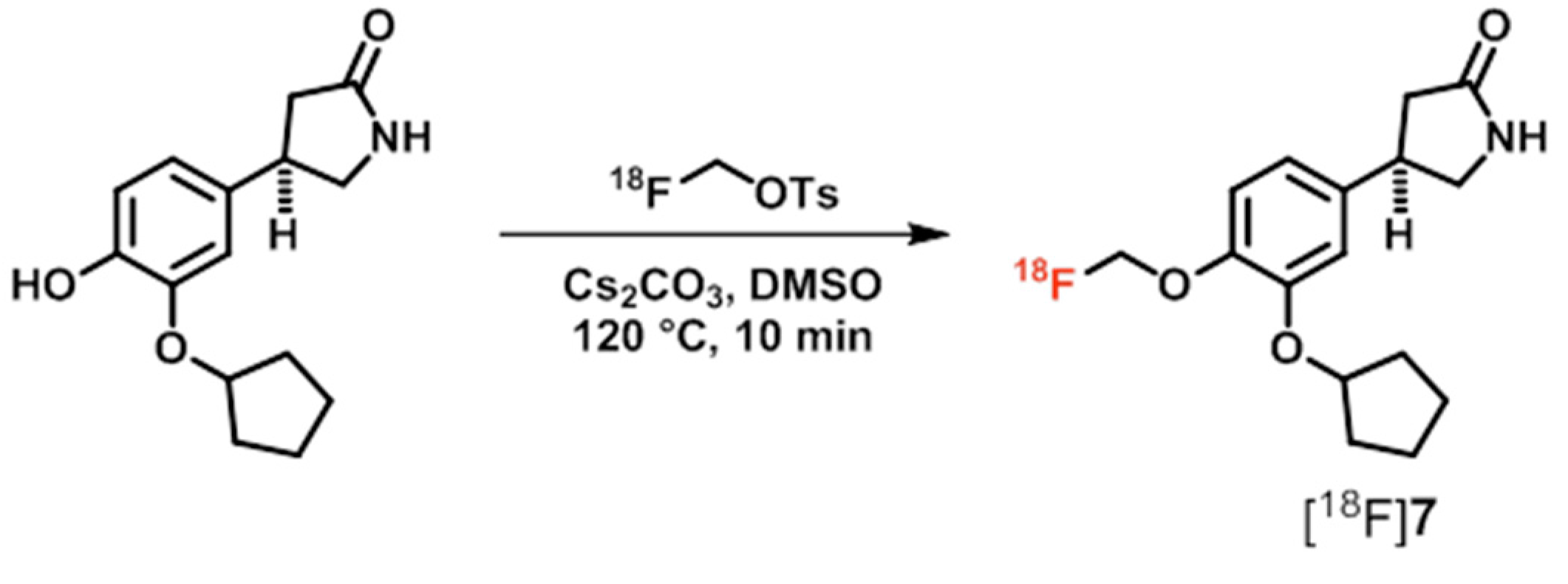 Initially, [18F]7 has been prepared in an one-pot two-step radiosynthesis procedure via 18F-labeling of diiodomethane using K+/[18F]F/K2.2.2-carbonate complex followed by O-alkylation of the corresponding phenol precursor with the resulting [18F]fluoroiodomethane [82]. At the 21st International Symposium on Radiopharmaceutical Sciences, Columbia 2015, the group has presented an optimized two-step radiolabeling strategy by first generating [18F]fluoromethane tosylate that has been used as a prosthetic group for subsequent O-alkylation of the phenol precursor under basic conditions (Scheme 4). In this radiosynthesis, the overall radiochemical yield of [18F]7 has been increased from 1.5% up to 29%. In PET studies on monkeys a fast and high uptake of [18F]7 in the brain has been observed, with specific distribution in regions of known PDE4 expression [82,83]. Although no data concerning the metabolic stability of [18F]7 have been published yet, the authors stated that the [18F]fluoromethyl group might be defluorinated in vivo leading to bone uptake of the resulting free [18F]fluoride [83] which is indeed a known process in the metabolism of 18F-alkylated radioligands. Thus, the group also synthesized and evaluated the deuterated analogue D2-[18F]7 (D2-[18F]MNI-617) [83,84]. PET studies in monkeys with D2-[18F]7 revealed a comparable brain distribution and kinetic profile like [18F]7. However, accumulation of activity in the skull indicates fast defluorination of D2-[18F]7 [83]. Despite the high and PDE4-specific brain uptake as well as the favorable brain kinetics of [18F]7 and D2-[18F]7, it has been concluded that these radioligands are not suitable for PET imaging of PDE4 because of their low metabolic stability [83].
