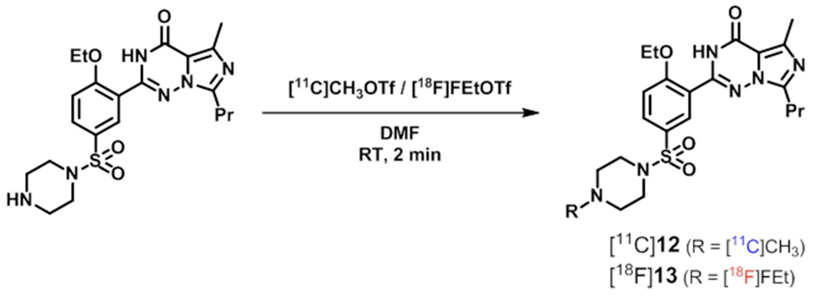 201. Jakobsen, S.; Kodahl, G.M.; Olsen, A.K.; Cumming, P. Synthesis, radiolabeling and in vivo evaluation of [11C]RAL-01, a potential phosphodiesterase 5 radioligand. Nucl. Med. Biol. 2006, 33, 593–597. [Google Scholar] [CrossRef] [PubMed]