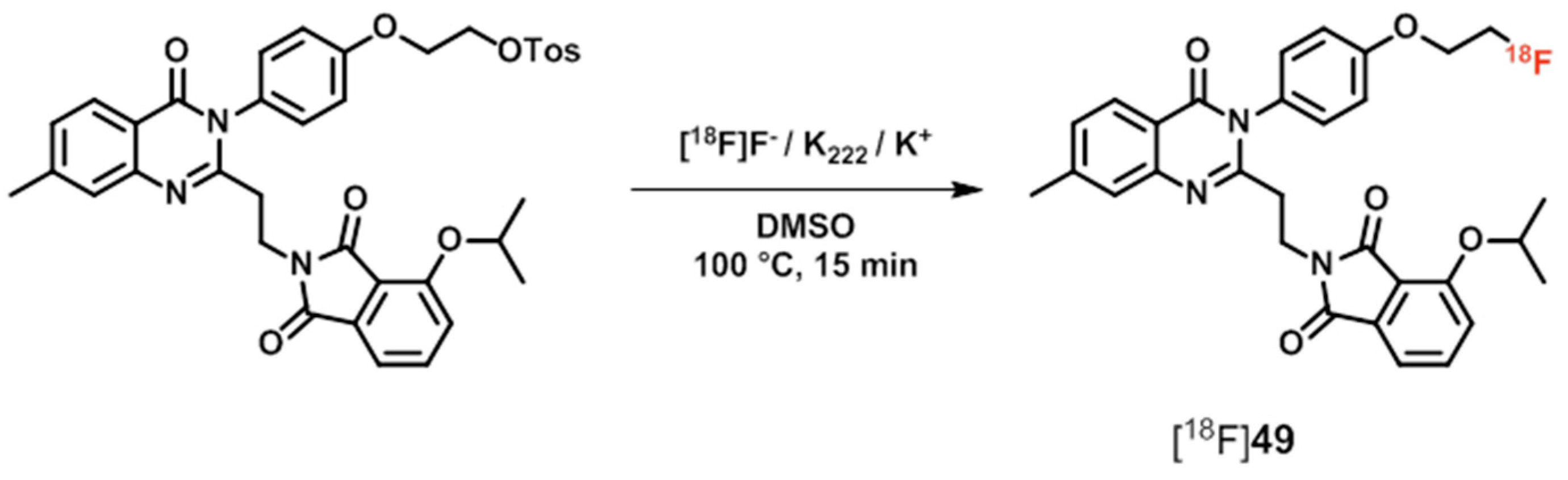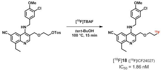 Up to now, no successful detection of PDE5 in the brain for quantification of its expression or occupancy has been reported. Very recently, the 18F-labeled quinoline-based radioligand [18F]18 ([18F]IC24027, Scheme 7) for PET imaging of PDE5A in the brain has been developed by researchers from the Institut national de la santé et de la recherche médicale (INSERM), Clermont-Ferrand, France, in cooperation with our group [110]. Radiosynthesis of [18F]18 has been performed by nucleophilic aliphatic substitution of the tosylate group of the corresponding precursor using tetra-n-butylammonium [18F]fluoride in tert-butanol (Scheme 7).