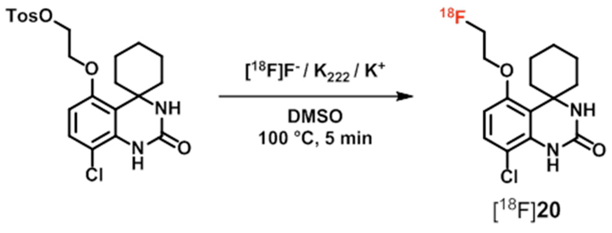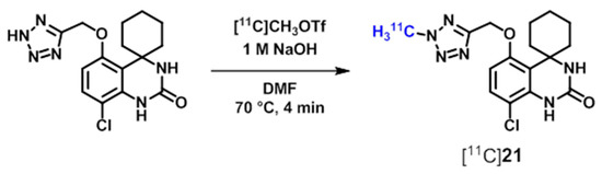 The spirocyclic compounds 20 and 21 are of high inhibitory potencies towards PDE7 with IC50 values of 17.0 nM and 1.7 nM, respectively [121,122]. The 18F-labeled analogue [18F]20 has been prepared by nucleophilic aliphatic substitution of the tosylate group of the corresponding precursor using K+/[18F]F/K2.2.2-carbonate complex (Scheme 8). A two-step procedure has been performed for the radiosynthesis of [11C]21 by methylation of the tetrazole precursor with [11C]methyl triflate under basic conditions (Scheme 9) [121,122]. Biodistribution studies with [18F]20 in mice revealed a high brain uptake (4%–5%ID/g) at 5 min post injection besides the highest accumulation of this radioligand in heart (10%–11%ID/g) [122]. In microPET imaging studies with [18F]20 and [11C]21, both radioligands displayed rapid uptake and homogenous distribution in the mouse brain followed by a fast wash out [121,122]. For [18F]20 the SUV in brain reached a plateau after 27 min [122] and that, together with the observed non-specific distribution of the radioligands, has been suggested as a result of radiometabolite accumulation in the brain. This presumption has been confirmed by in vivo metabolite analysis demonstrating only 74% and 85% of intact [18F]20 and [11C]21 in mouse brain at 5 min post injection, respectively [121,122]. For [18F]20, the brain penetrating radiometabolite has been identified as 2-[18F]fluoroethanol by HPLC analysis using the non-radioactive 2-fluoroethanol as reference [122]. Finally, the radioligands [18F]20 and [11C]21 are suggested to be unfavorable for in vivo quantification of PDE7 in the brain via PET, and development of more stable spiroquinazolinone derivatives is currently in progress [122].