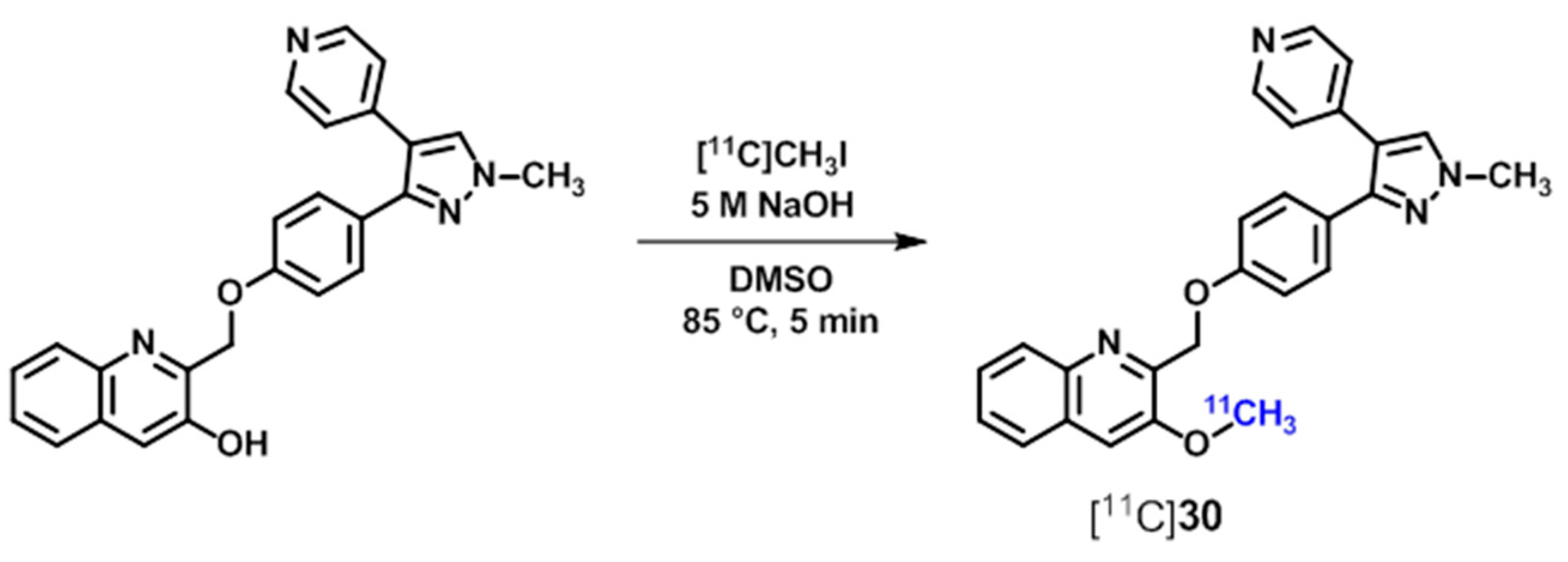 The 3-, 4-, and 6-methoxy derivatives 30 (TZ1964B), 31, and 32 as well as the 4-methoxy regioisomer 33 are of high potency (Figure 6) and selectivity towards PDE10A [157,159]. The radioligands [11C]3033 have been prepared by methylation of the corresponding quinolinol precursors [158] with [11C]methyl iodide under basic conditions [157] (Scheme 10 for [11C]30). Out of this series, [11C]30 and the most potent derivative [11C]31 showed the highest brain uptake in rats with striatum-to-cerebellum ratios of 6.0 and 4.5 at 60 min post injection, respectively [157]. MicroPET studies in non-human primates with [11C]30 and [11C]31 revealed a high and specific accumulation of both radioligands in striatum. Metabolic degradation of [11C]31 occurred significantly faster compared to [11C]30 with 42% and 65% of the intact radioligands in plasma at 60 min post injection [157]. Further evaluation of [11C]30 ([11C]TZ1964B) and its tritiated analogue [3H]30 ([3H]TZ1964B) in rats and non-human primates [160] revealed high PDE10A-specific and reversible binding. In conclusion, [11C]30 has been stated as the most promising candidate for in vivo quantification and visualization of PDE10A in the brain via PET because of its high brain uptake and striatum-to-cerebellum ratio, good striatal retention, favorable metabolic stability as well as advantageous brain kinetics [157].