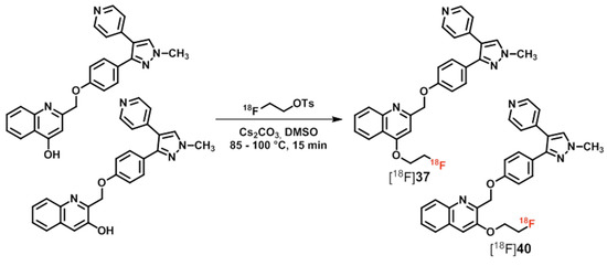 Out of a series of related fluorine-containing quinoline derivatives, 3440 (Figure 6) displayed high potency and selectivity towards PDE10A with IC50-values in a range of 0.24 to 1.80 nM [158]. Most of the corresponding radioligands have been prepared in one-step labeling procedures by (1) direct nucleophilic halogen exchange for [18F]34 and [18F]35, and (2) aliphatic substitution via the related tosylate or mesylate precursors for [18F]36, [18F]38, and [18F]39. A two-step labeling strategy has been performed for the radiosyntheses of [18F]37 and [18F]40 using 2-[18F]fluoroethyl tosylate [158] (Scheme 11).