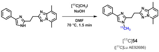 The radioligand [11C]54 ([11C]Lu AE92686, Scheme 16), published by Kehler et al. [182,183], has been selected as a promising candidate for PET imaging of PDE10A based on the favorable in vitro and in vivo properties of the non-radioactive compound [184], such as high inhibitory potency towards PDE10A (IC50 = 0.46 nM [183]; IC50 = 0.32 nM [184]; IC50 = 0.39 nM with > 1000-fold selectivity over other PDEs) and brain uptake (brain-to-plasma ratio in mice = 0.47) [182]. [11C]54 has been prepared by N-alkylation of the corresponding imidazole precursor using [11C]methyl iodide under basic conditions [182,183] (Scheme 16).