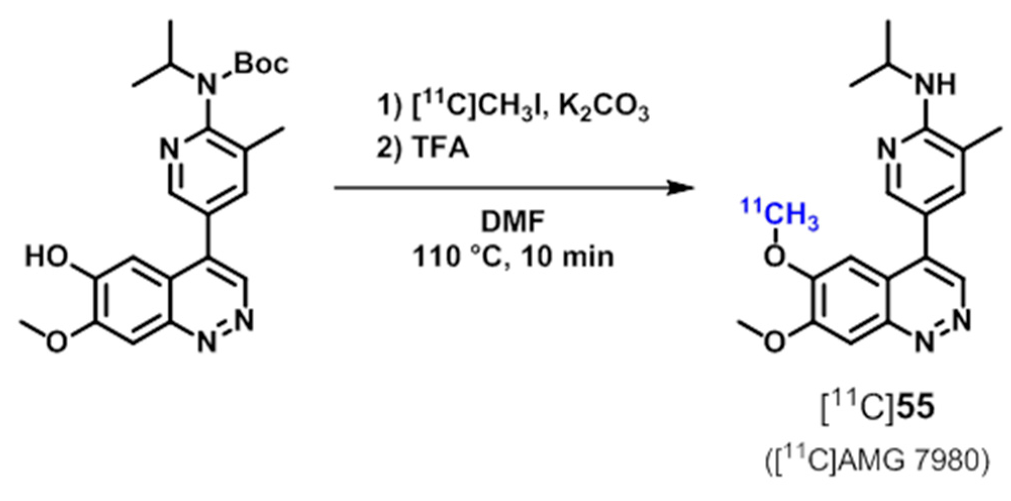 The radioligand [11C]55 has been prepared in a one-pot two-step radiosynthesis by 11C-labeling of the N-tert-butoxycarbonyl (BOC)-substituted phenol precursor using [11C]methyl iodide followed by acidic hydrolysis to remove the protecting group [185] (Scheme 17). Radiosynthesis of [18F]56 has been performed by direct nucleophilic aliphatic halogen exchange using the corresponding bromo precursor and the K+/[18F]F/K2.2.2-carbonate complex [187] (Scheme 18).