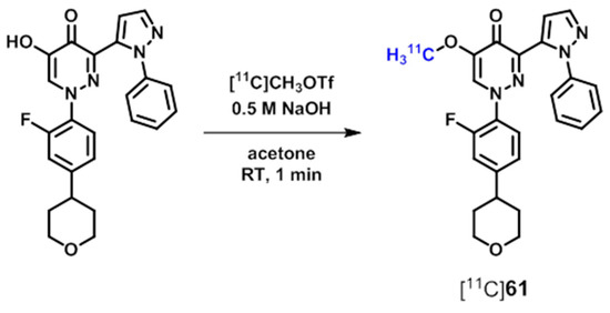 Moreover, a series of 11C-labeled radioligands based on a pyrazolopyridazine scaffold [189] has been reported by Stepanov et al. [190]. The radioligands [11C]5864 (Figure 13) have been prepared by O-alkylation of the corresponding 1,3-disubstituted 5-hydroxypyridazin-4(1H)-one precursors using [11C]methyl triflate under basic conditions [190] (Scheme 19 for [11C]61).