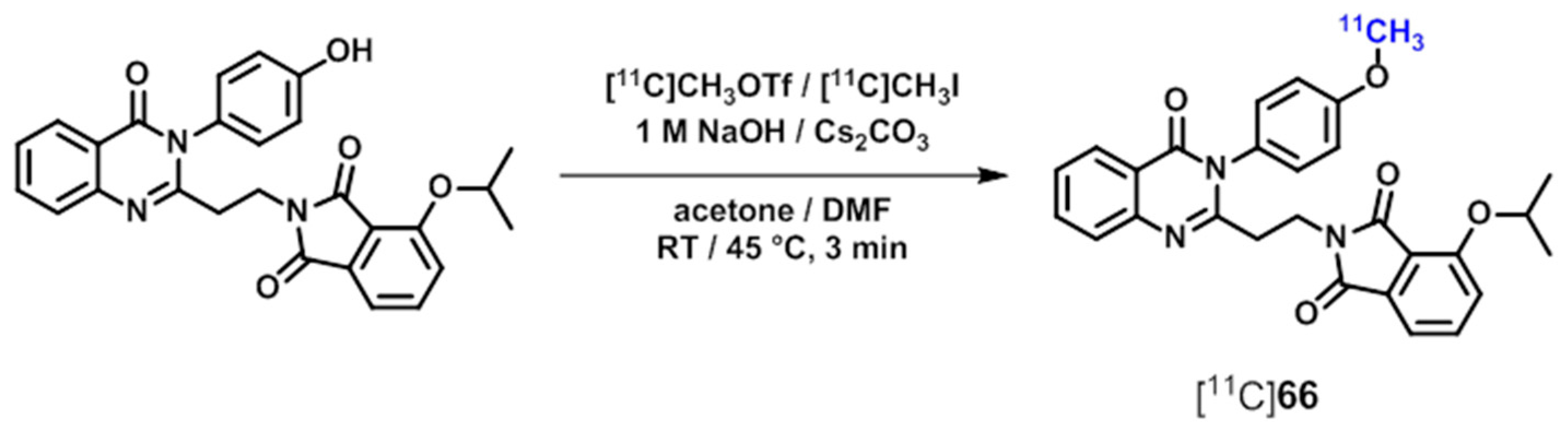 Consequently, the authors stated [11C]66 to be the most promising candidate out of this series because of its favorable in vivo profile including brain uptake and kinetics, as well as an appropriate target-to-non-target ratio indicating high specific binding [196]. Radiosynthesis of [11C]66 has been performed by O-alkylation of the corresponding phenol precursor using [11C]methyl triflate or [11C]methyl iodide under basic conditions [196,197,199] (Scheme 20).