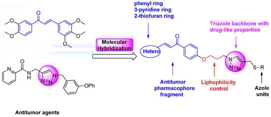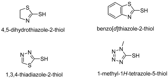 On the other hand, the heterocyclic azoles, including 4,5-dihydrothiazole-2-thiol, benzo[d]thiazole-2-thiol, 1,3,4-thiadiazole-2-thiol, and 1-methyl-1H-tetrazole-5-thiol (Figure 2), represent one of the most useful cores of anticancer agents, with a wide range of activities against various cancers [22]. These above interesting findings and our continuous quest to identify more potent analogues, led to the molecular hybridization of chalcone, 1,2,3-trizole, and different azoles to integrate them in one molecular platform to generate a new hybrid architecture with the aim of exploring the impact of such modification on the anticancer agents [23,24].