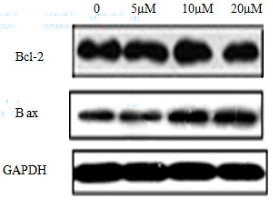 Antiproliferative agents that induce apoptosis in cancer cells are always preferred in antitumor drug discovery. Bcl-2 associated proteins have both anti-apoptotic and pro-apoptotic effects in vrious cancer cell lines. For the high potent cytotoxic activity against SK-N-SH cell line, compound I-21 was evaluated the level of Bcl-2 (apoptotic inhibitor) and Bax (apoptotic inducer) [24]. We can see from the result that compound I-21 increased the level of Bax and reduced the level of Bcl-2, which could promote apoptosis of SK-N-SH cells (Figure 6). Further mechanism investigations are under way and will be reported in due course.