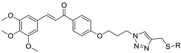 (E)-1-(4-(3-(4-(((1,3,4-Thiadiazol-2-yl)thio)methyl)-1H-1,2,3-triazol-1-yl)propoxy)phenyl)-3-(3,4,5-trimethoxyphenyl)prop-2-en-1-one (I-21): White solid, yield: 56%; m.p. 124–127 °C. 1H-NMR (400 MHz, CDCl3) δ 9.00 (s, 1H), 8.02 (d, J = 8.7 Hz, 2H), 7.72 (d, J = 15.8 Hz, 2H), 7.43 (d, J = 15.6 Hz, 1H), 6.93 (d, J = 8.6 Hz, 2H), 6.88 (s, 2H), 4.67 (s, 2H), 4.56 (t, J = 6.7 Hz, 2H), 4.02 (t, J = 5.7 Hz, 2H), 3.93 (s, 6H), 3.90 (s, 3H), 2.47–2.37 (m, 2H). 13C-NMR (100 MHz, CDCl3) δ 188.67, 165.02, 162.13, 153.47, 151.88, 144.33, 143.35, 140.31, 131.49, 130.85, 130.51, 123.81, 121.17, 114.26, 105.63, 64.35. HRMS (ESI) calcd for C26H27N5O5S2 [M + H]+: 553.1454, found: 553.1454.
