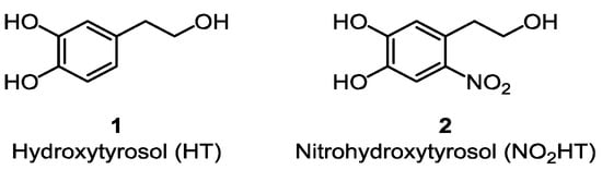 Adherence to the Mediterranean Diet has been associated with reduced risk of suffering from several pathological conditions including cardiovascular, cerebrovascular and neurodegenerative diseases [1]. Many studies conclude that polyphenols present in olive oil are responsible, among other compounds, for these effects due mainly to their potent antioxidant activities [2,3,4]. The main phenolic compounds in olive oil are free hydroxytyrosol (HT, 1) (Figure 1) and its secoiridoid derivatives. In this sense, the European Food Safety Authority (EFSA) has recently released a health claim concerning phenolic compounds in olive oil and their ability to protect low-density lipoprotein from oxidative damage [5].