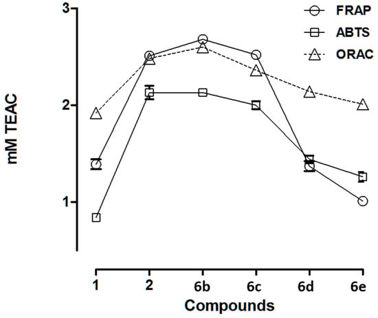 Results of the reducing power of new compounds (6b–e) obtained using the FRAP assay and the radical scavenging activity using ABTS and ORAC assays in comparison to free HT (1) and NO2HT (2) are summarized in Table 3 and Figure 2. Data are expressed as millimolar TEAC (Trolox equivalent).