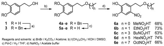 In the present work, the synthesis of alkyl ethers nitroderivatives of HT (6a–e), with side chain lengths from one to eight carbon atoms (Scheme 1) is presented, as a second family of lipophilic nitroderivatives of HT, and their antioxidant activity is evaluated using Reducing Antioxidant Power (FRAP), 2,2′-azinobis(3-ethylbenzothiazoline-6-sulfonic acid) diammonium salt (ABTS), and Oxygen Radical Scavenging Capacity (ORAC) assays.