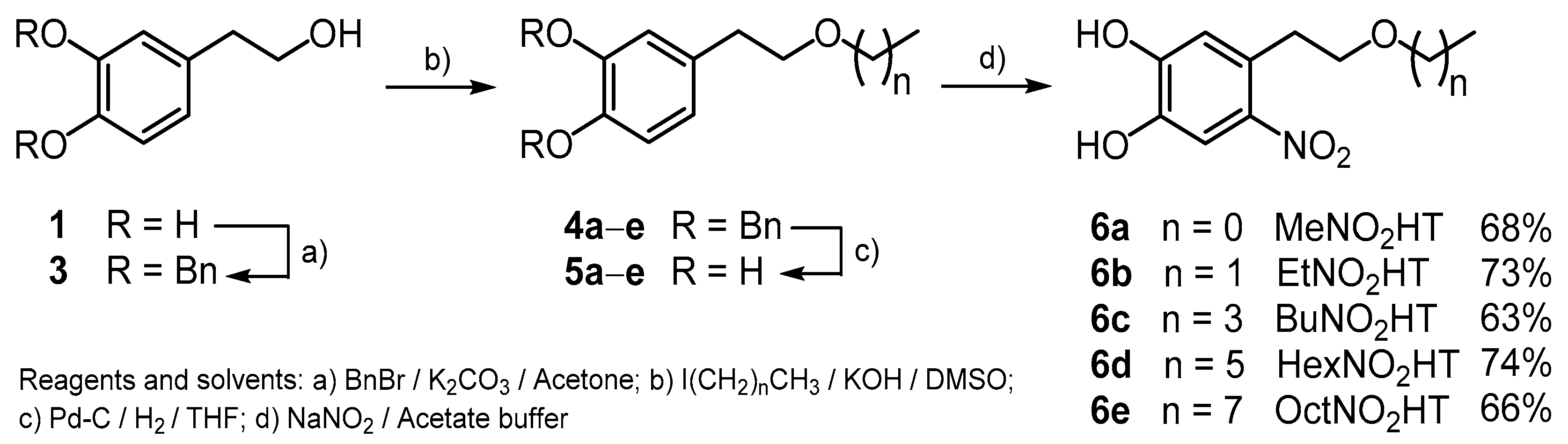 2.1. Preparation and Characterization of Alkyl Nitrohydroxytyrosyl Ethers (6a–e)