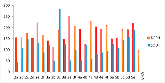 The SOD activity of the compounds was investigated by an NBT assay and the results are shown in Table 1 and Figure 2. Compound 2a (IC50 = 45.12 µg/mL) was the most effective of all compounds for scavenging superoxide radicals (O2−•). Compounds 3b (IC50 = 51.37 µg/mL), 3e (IC50 = 52.89 µg/mL) and 4a (IC50 = 55.67 µg/mL) also exhibited strong superoxide radical scavenging activity.