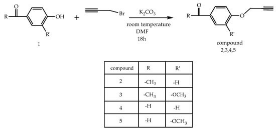 Acetylene derivatives 1 (0.010 mol) and potassium carbonate (0.015 mol) were refluxed in DMF for 1 h. The reaction mixture was cooled to room temperature and propargyl bromide (0.01 mol) was added and the mixture stirred at room temperature for 24 h. The reaction mixture was poured into 200 mL of ice-cold water. The solid obtained was washed with water and recrystallized from ethanol to afford the desired title compounds 2–5 [17].