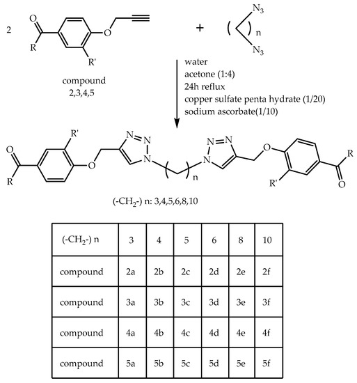 The synthesis of the intermediate and target compounds was performed according to the reactions outlined in Scheme 1. As shown, commercially available hydroxy acetophenones or benzaldehydes were subjected to O-alkylation with propargyl bromide in the presence of K2CO3 in DMF. The starting compounds 2–5 were obtained following a previously reported literature procedure [17]. Then compounds 2–5 were reacted with the bisalkylazide derivatives 1,3-diazido-propane, 1,4-diazidobutane, 1,5-diazidopentane, 1,6-diazidohexane, 1,8-diazidooctane and 1,10-diazidodecane ((-CH2-)n, n = 3, 4, 5, 6, 8, 10) under standard “click chemistry” conditions using a copper sulfate pentahydrate/sodium ascorbate system as catalyst, also known as the Huisgen 1,3-dipolar cycloaddition reaction. The reaction conditions in this step are crucial. Because when tert-butyl alcohol/water or ethanol/water solutions were used as solvent this reaction failed to afford the target molecules under these conditions, it was tested with a (1:4) ratio acetone/water solvent system whereby unlike in those solvent systems, the synthesis of the target molecules 2–5(a–f)) was accomplished.