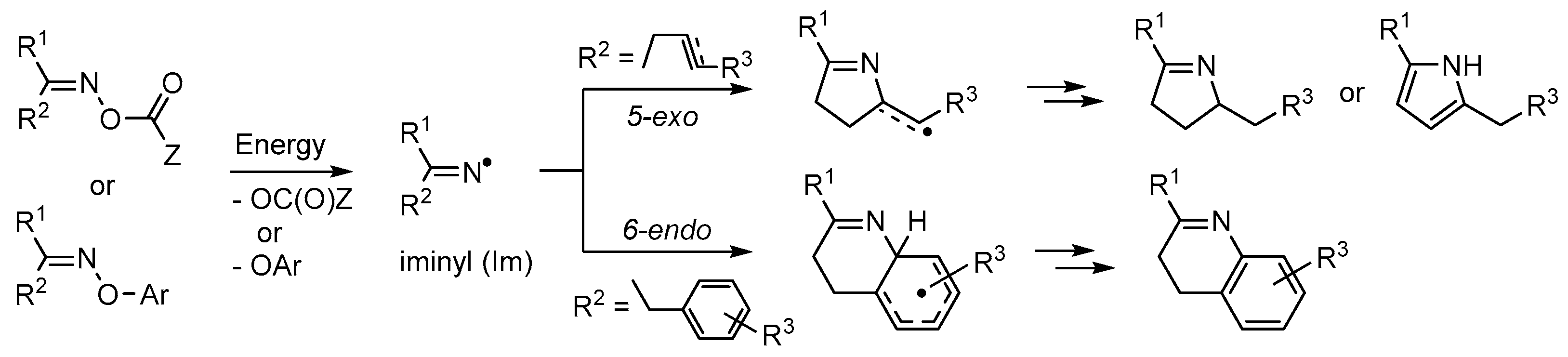 When fittingly stimulated, both compound types initially yield N-centred iminyl radicals >C=N• (Im, Scheme 1). Those suitably accoutred with acceptor groups can, when appropriately manipulated, yield azaheterocycles. An O-centred radical [•OC(O)Z] is released from a carbonyl oxime together with the iminyl radical and can be chosen to end up as volatile or otherwise easily separable by-products. For the oxime ether precursors, best results are usually achieved with O-aryl substituents. In this case the by-product is usually a phenol (ArOH) which can readily be removed because of its mild acidity. Iminyl radicals with butene or butyne type side chains selectively undergo 5-exo cyclisation to produce 5-member ring containing dihydropyrrole type products. By way of contrast, iminyl radicals with aromatic or heteroaromatic acceptor substituents preferentially yield 6-membered ring pyridine, quinoline etc. products. In some instances this results from an initial 5-exo spiro cyclization followed by ring expansion via an aziridinyl type intermediate (see for example Section 4.1). Preparations of many different azaheterocycle types may therefore be achieved by careful choice of the acceptor substituent(s), and by tuning the reaction conditions and methodology.