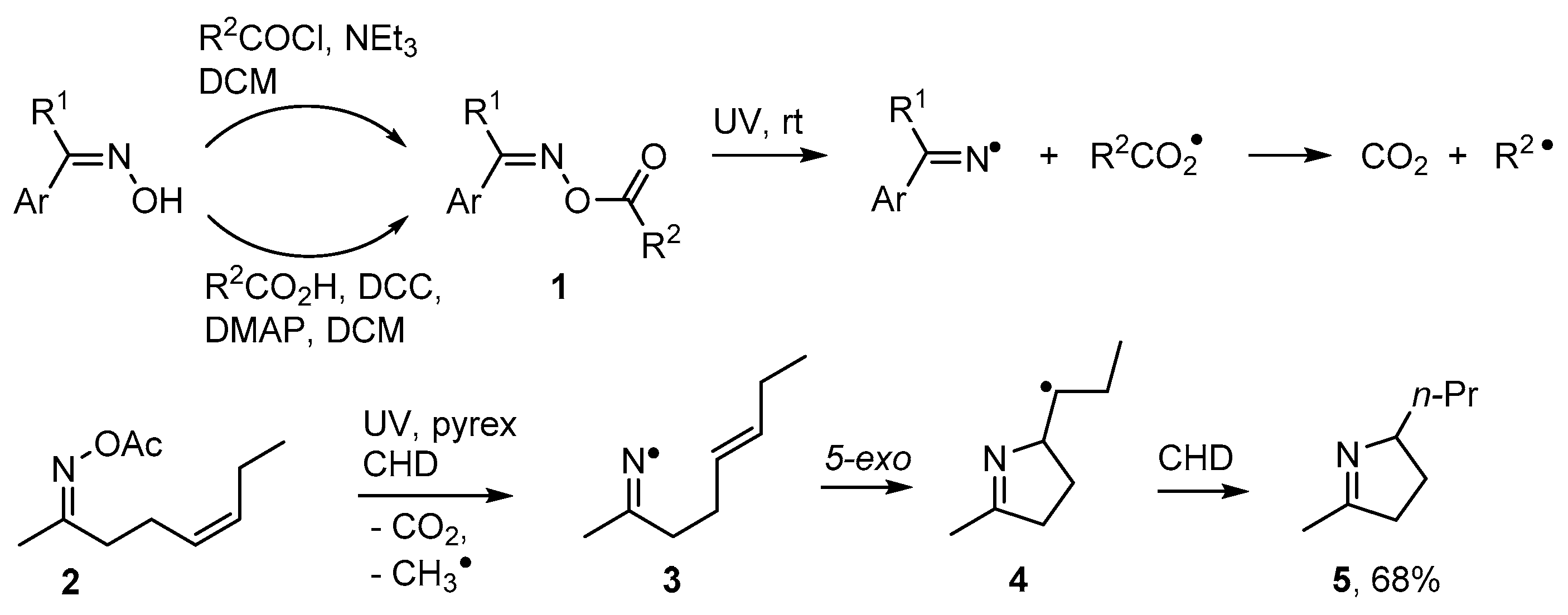 Numerous alkaloids contain pyrrole, dihydropyrrole or related rings and many biological roles are associated with these structures [44,45,46]. Oxime esters 1 can easily be prepared from oximes reacting with either carboxylic acids or acyl halides [47,48]. On photolysis they release an iminyl radical together with an acyloxyl radical and the latter rapidly extrudes CO2 with production of a C-centred radical [48,49] (Scheme 2). Rodrigues, Sampedro and co-workers used acyl oximes such as 2 as efficient sources of iminyl radicals [50,51,52]. With this precursor type, the radical co-produced with the iminyl during UV photolyses was acyloxyl [CH3CO2•] that simply furnished volatile CH4 and CO2 as by-products. They reported that the iminyls could be conscripted into syntheses of many types of heterocycles including dihydropyrroles. UV photolysis of 2 through Pyrex released iminyl radical 3 with an alkenyl side chain. These selectively cyclised in the 5-exo mode with production of pyrolidinylmethyl radical 4 that subsequently abstracted an H-atom from co-reactant cyclohexa-1,4-diene (CHD) to yield 3,4-dihydropyrrole derivative 5 (Scheme 2).