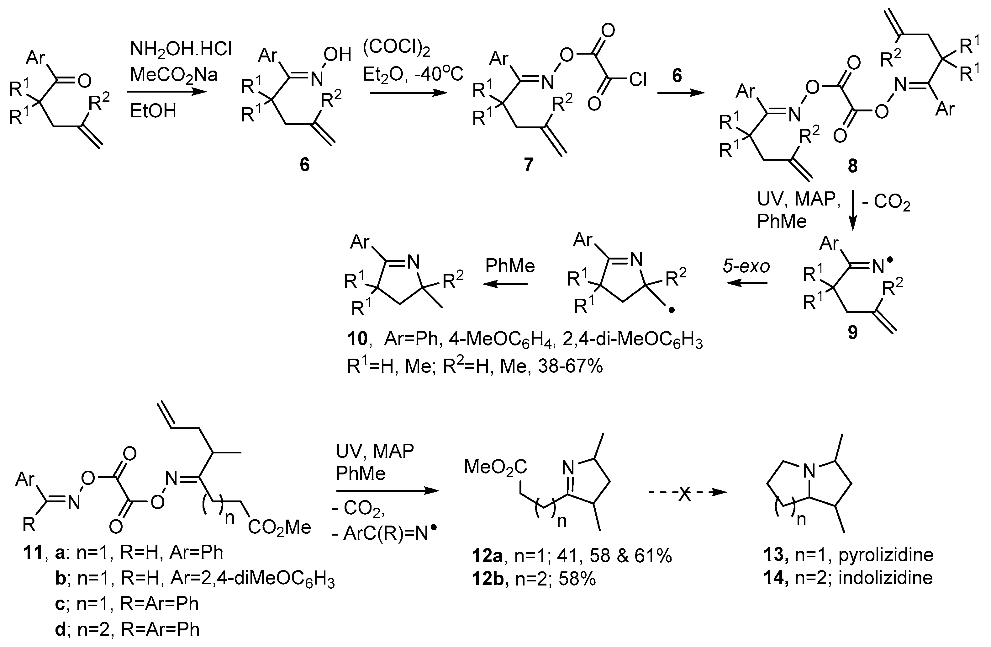 3,4-Dihydropyrrole derivatives 10 were obtained in moderate yields with toluene acting as both solvent and H-atom donor (Scheme 3). Unsymmetrical dioxime oxalates such as 11 incorporated an aryl-oxime unit, to promote photo-dissociation, as well as an alkenic acceptor unit. These precursors enabled non-aromatic dihydropyrroles such as 12a,b to be accessed. Attempts to convert the latter to pyrolizidines 13 and indolizidines 14 were unsuccessful.