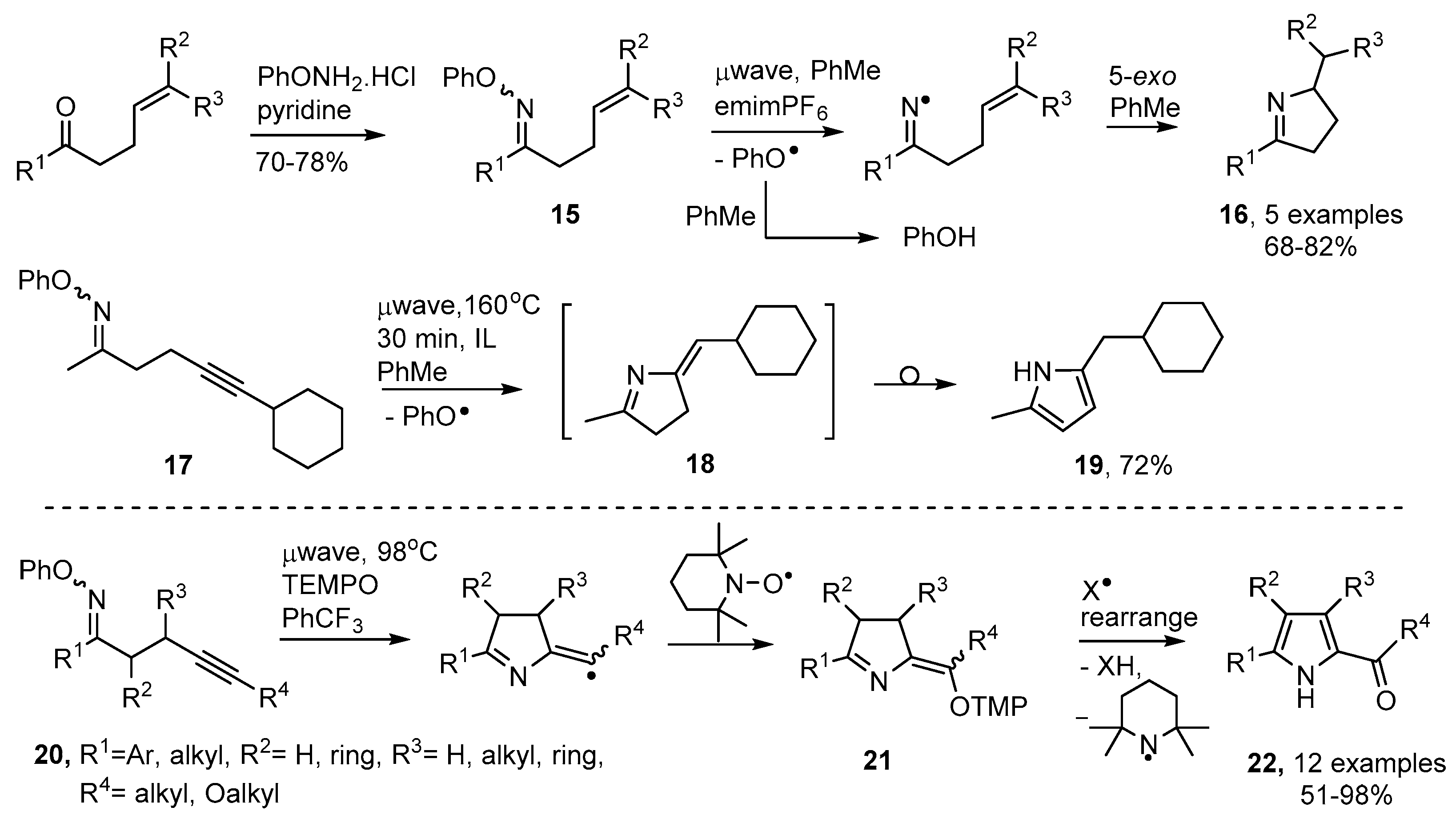 Castle and co-workers prepared a set of alkyne-substituted oxime ethers 20 and carried out microwave irradiations of mixtures with tetramethylpiperidine-N-oxide (TEMPO) in benzotrifluoride solvent [58]. The ring closed radicals were trapped by the TEMPO with production of intermediates 21 (Scheme 4). These also rearranged, with loss of a piperidinyl radical, so providing 2-acylpyrroles 22 in good to excellent yields.