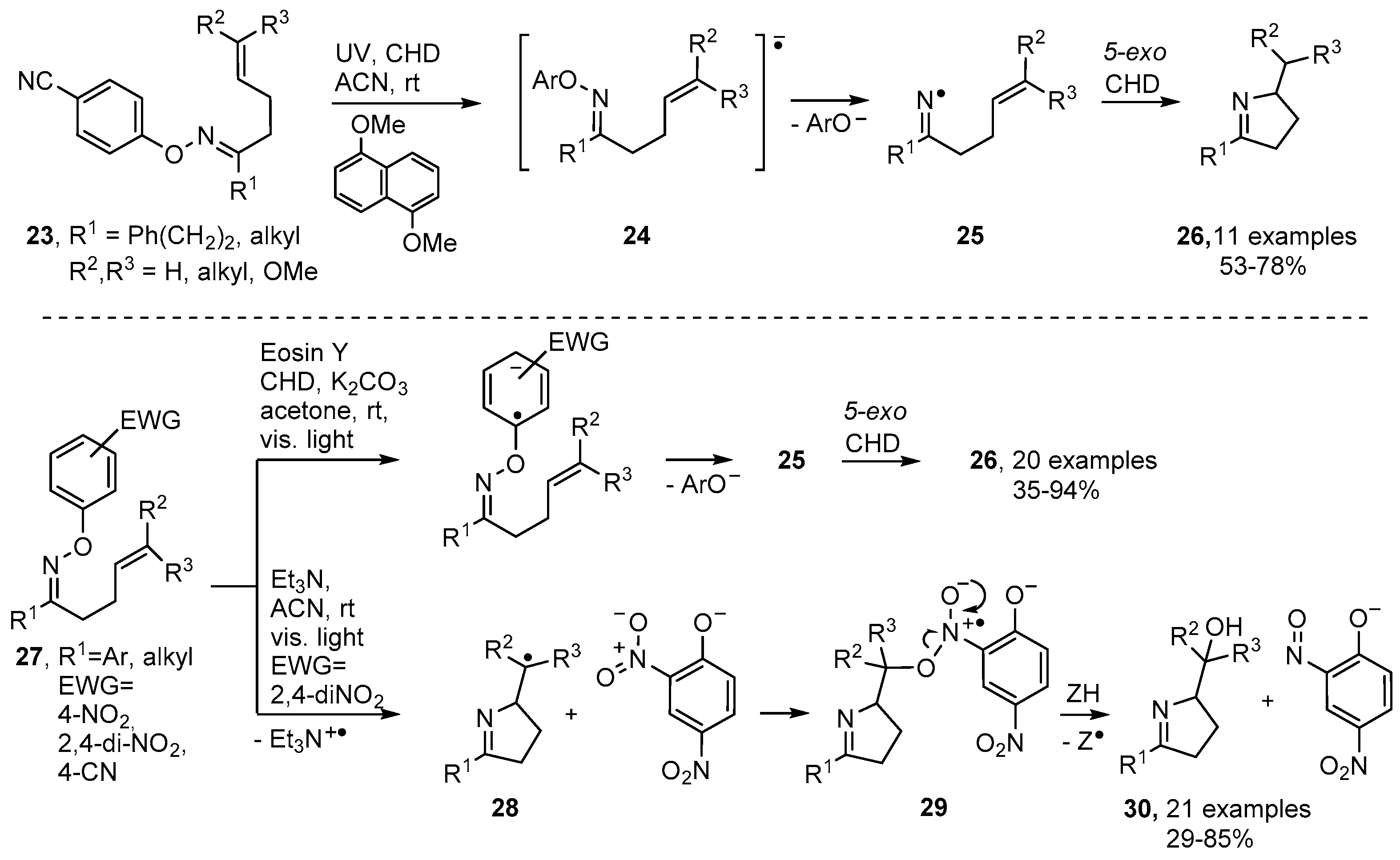 Photoredox catalytic methodology [25,27,59] has also been developed for production of dihydropyrroles from O-aryl oxime ethers substituted with electron withdrawing groups (EWG) in their O-aryl units. Narasaka and co-workers prepared oxime ethers 23 containing 4-CN (or 2,4-di-NO2 or 4-CF3) aryl substituents. On inclusion of a catalytic amount of 1,5-dimethoxynaphthalene (DMN) and irradiation with UV light in 1,4-cyclohexadiene, dihydropyrroles 25 were isolated in good yields (Scheme 5) [60]. The incident light raised the photocatalyst to an excited triplet state (PC*) that then transferred an electron to the oxime ethers with production of the radical anions 24 (Scheme 5). Loss of the stable phenolate type anions then occurred with release of the corresponding iminyl radicals that subsequently underwent 5-exo cyclisation and H-atom transfer with CHD to afford dihydropyrroles 25.