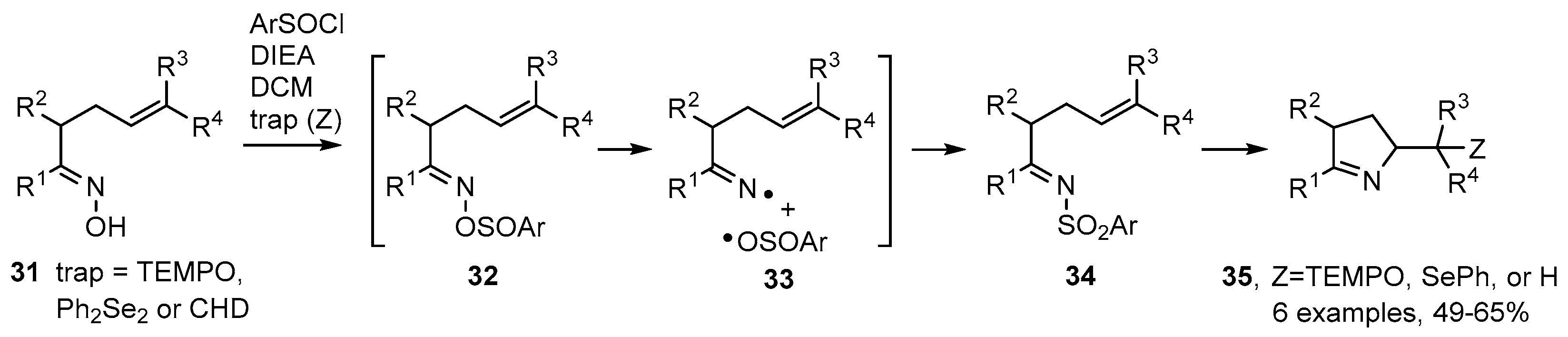 Weinreb and co-workers described an alternative strategy in which oximes 31 could be used directly when treated with 2,6-dimethylbenzenesulfinyl chloride in the presence of Hunig’s base (N,N-diisopropylethylamine, DIEA) and a radical trapping agent in dichloromethane (DCM) [61]. The best radical traps (Z) were found to be TEMPO and diphenyl diselenide; but CHD could also be used when in great excess (Scheme 6). Probably sulfinate esters 32 were first formed that dissociated to a caged iminyl/sulfonyl radical pair 33. The reformed N-sulfonylimines 34 then released iminyl radicals that cyclised and were trapped to afford functionalised dihydropyrroles 35 in moderate to good yields (Scheme 6).