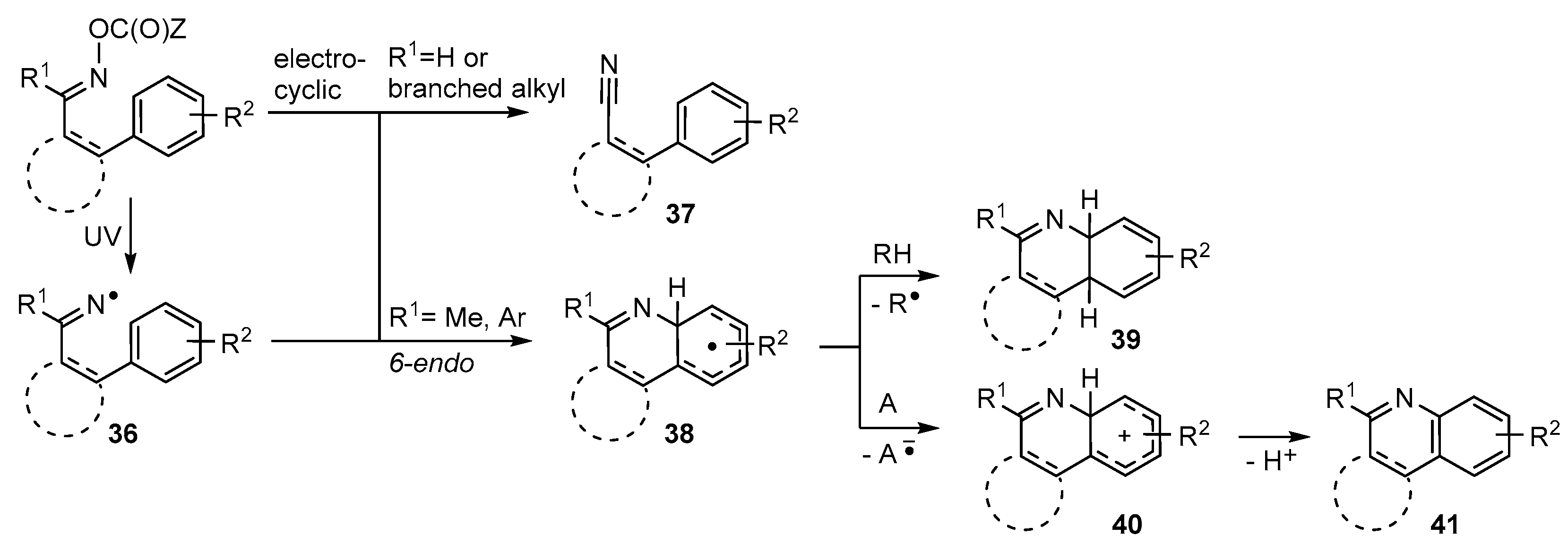 It is usually necessary to work with precursors having the second imine substituent R1 either Me or Ar. If R1 is H (or a branched alkyl group) formation of a nitrile 37 is either the main process, or 37 is an important by-product (Scheme 7). Nitrile formation may entail an electrocyclic process of the oxime ester; in which case the proportion may be diminished by suitable solvent choice. With several types of oxime esters cyclisations onto aromatic rings initially create cyclohexadienyl type radicals 38. If a suitable H-donor is present as solvent, or otherwise, H-atom transfer to radicals 38 yields cyclohexadienes 39 as a mixture of isomers. In practice this route has rarely been developed. Instead restoration of aromaticity to the acceptor ring has usually been observed as in quinoline derivative 41. This can result when some radical in the system abstracts the highly labile tertiary H-atom of the cyclohexadienyl ring in radical 38. However, this is a disproportionation that requires two radicals to meet and so is not favored because reactive radical concentrations are always very low. The alternative is that an acceptor molecule A is either added, or is adventitiously present, and single electron transfer (SET) occurs with production of the corresponding cyclohexadienyl cations 40. These rapidly deprotonate to yield cyclised products 41 with restored aromaticity. This oxidative process is facilitated by non-H-atom donor solvents such as PhCF3 or t-BuOH.