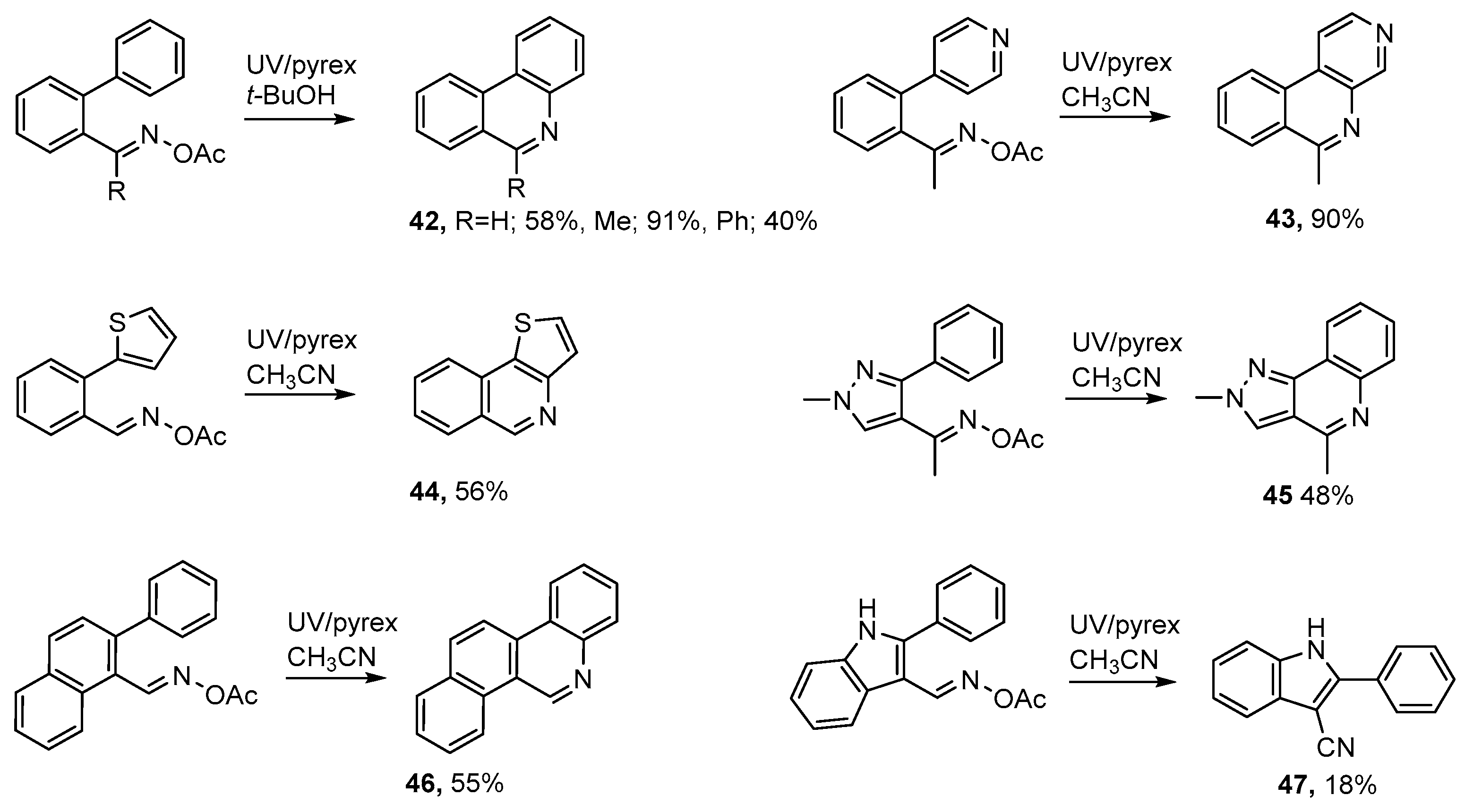 Formyl and acyl derivatives of biphenyl, 4-phenylpyridine, 2-phenylthiophene, 3-phenylpyrazole, 2-phenylnaphthalene, 2-phenylindole and analogous aromatics are readily accessible and can be converted to the corresponding acyl oximes without difficulty (see Scheme 8). UV photolyses of these precursors through Pyrex in acetonitrile or t-butanol solutions enabled several 6-substituted phenanthridines 42 to be prepared [50,52]. Similarly, benzo[c][1,7]naphthyridines 43, and thieno[3,2-c]isoquinolines 44 were conveniently prepared from the corresponding acyloximes.