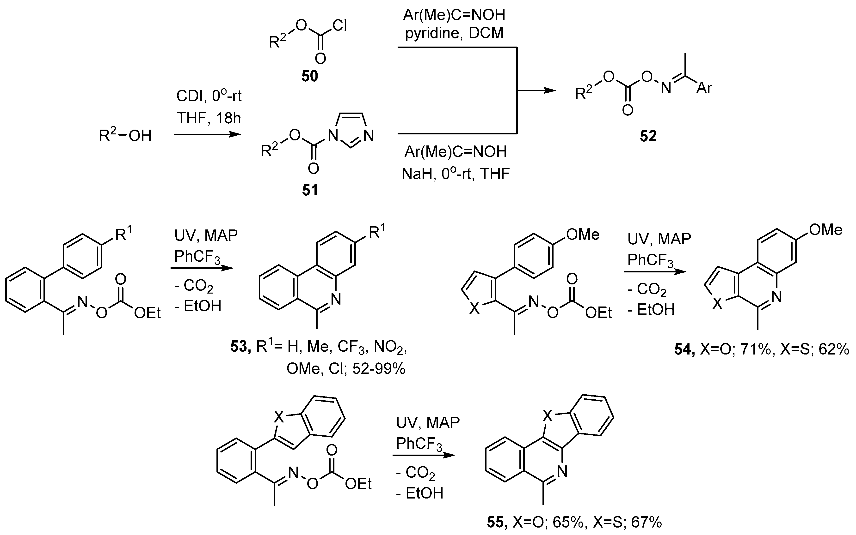 Oxime carbonates 52 can be prepared either by treatment of an oxime with a chloroformate 50 or via the 1H-imidazole-1-carboxylates 51. The latter can be obtained from reaction of an alcohol with carbonyldiimidazole (CDI) (see Scheme 10). For the preparation of aza-arenes commercial ethyl chloroformate (50, R2 = Et) was found to be very convenient because the main by-product (EtOH) is volatile and easily separated. UV photolyses of appropriately functionalised oxime carbonates, with MAP as additive, enabled phenanthridines 53, methylfuro- and methylthieno-[2,3-c]quinolines 54 to be prepared as well as the 5-methylbenzofuro- and 5-methylbenzo[4,5]thieno-[3,2-c]isoquinolines 55 in generally good yields [75,77].