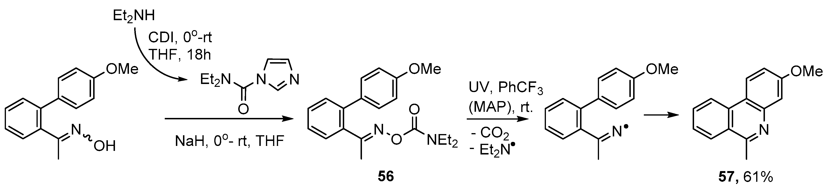 Oxime carbamates 56 offer another alternative for aza-arene syntheses but have not yet been much exploited. The Et2N aminyl group is sufficiently small that by-products derived from it volatilize away. UV irradiation of 56 in PhCF3 at room temperature and with MAP additive provided 3-methoxy-6-methylphenanthridine 57 in 60% yield (Scheme 11) [78]. A slightly higher yield (61%) was obtained in the absence of MAP. This was a worthwhile finding because residues of the photosensitizer can be troublesome to remove.
