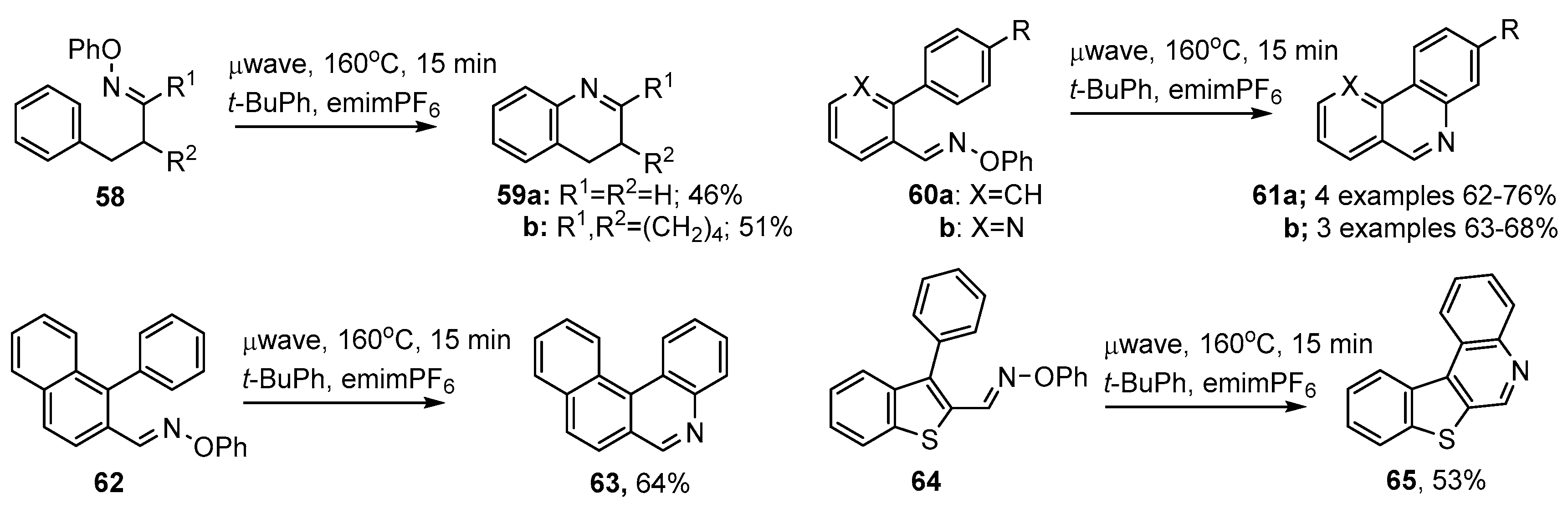 As mentioned above (Section 2.2) O-aryl oxime ethers, including those with appropriately placed aryl acceptor units, can easily be made from carbonyl compounds. The 3-phenylpropanone O-phenyl oxime ethers 58 were subjected to microwave irradiation at 160 °C in t-BuPh together with emimPF6 ionic liquid. Quinoline 59a and tetrahydroacridine 59b were thereby produced in moderate yields [56,57] (Scheme 12).