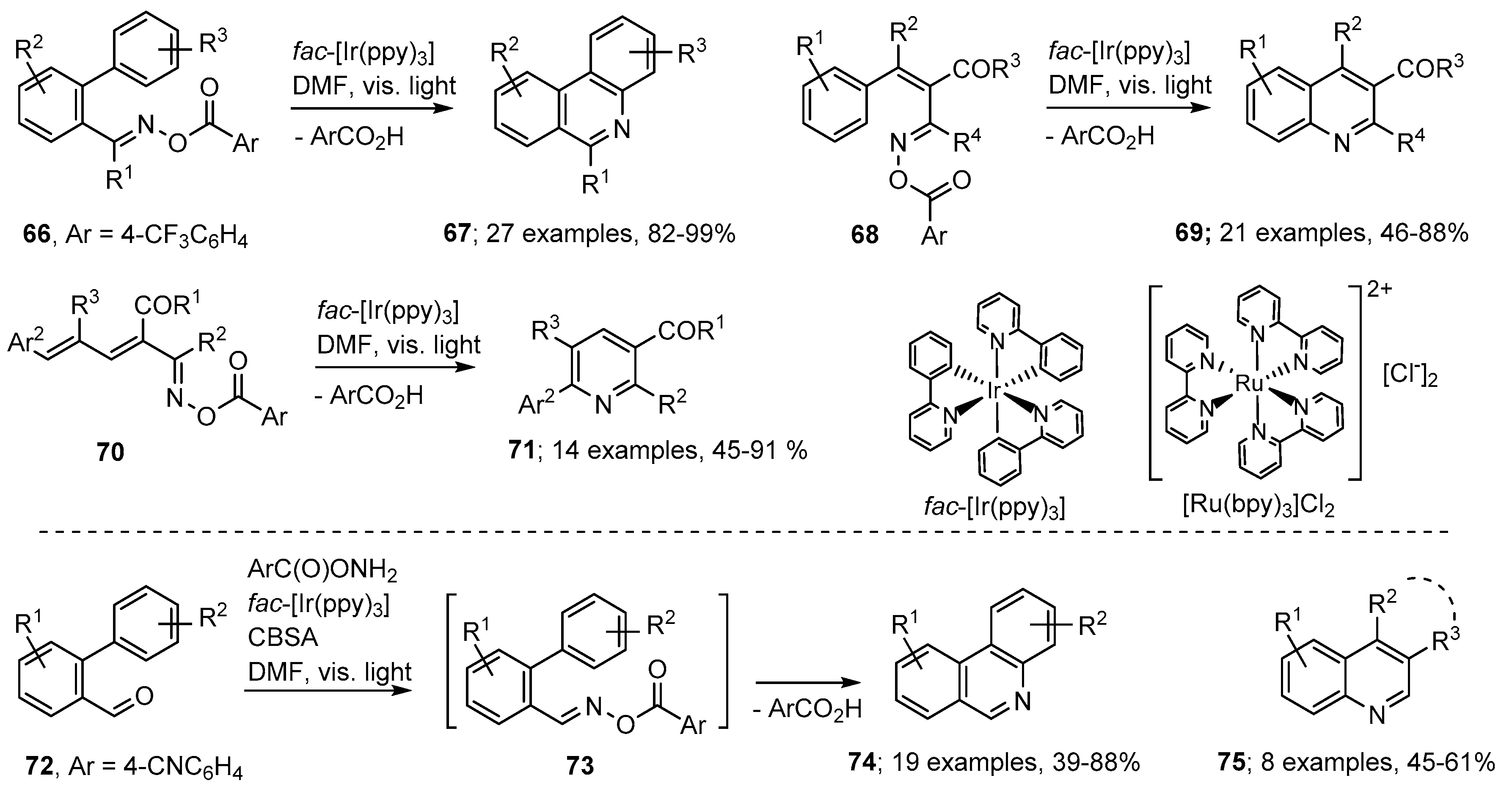 The advantages of photoredox catalyzed processes include that visible light, rather than more damaging UV radiation, is usually sufficient and that only catalytic quantities of the PC are required. Several such methods have been reported recently for aza-arene preparations with oxime derivatives as starting materials For example, Zhang, Yu and co-workers generated iminyl radicals from a wide range of aroyl oximes with fac-[Ir(ppy)3] (ppy = 2-phenylpyridine) as PC [79]. The most reliable and efficient aroyl group was shown to be 4-trifluoromethylbenzoyl; although other electron deficient benzoates succeeded to variable extents. Visible light irradiations of biphenyl aroyl oximes 66 with catalytic quantities of fac-[Ir(ppy)3] in DMF produced phenanthridine derivatives 67 in very impressive yields (Scheme 13). The PC catalysed the formation of a radical anion from the substrate that then released an iminyl radical together with the 4-trifluorobenzoate anion. The non-H-atom donor solvent DMF favoured production of the fully aromatic products shown. Using similar methodology, the precursors 68 yielded quinolines 69 with a good range of functionality. Furthermore, aroyl oxime esters 70, with butadienyl substituents, led to iminyl radicals that ring closed selectively in 6-endo mode with eventual production of pyridine derivatives 71, generally in very good yields.